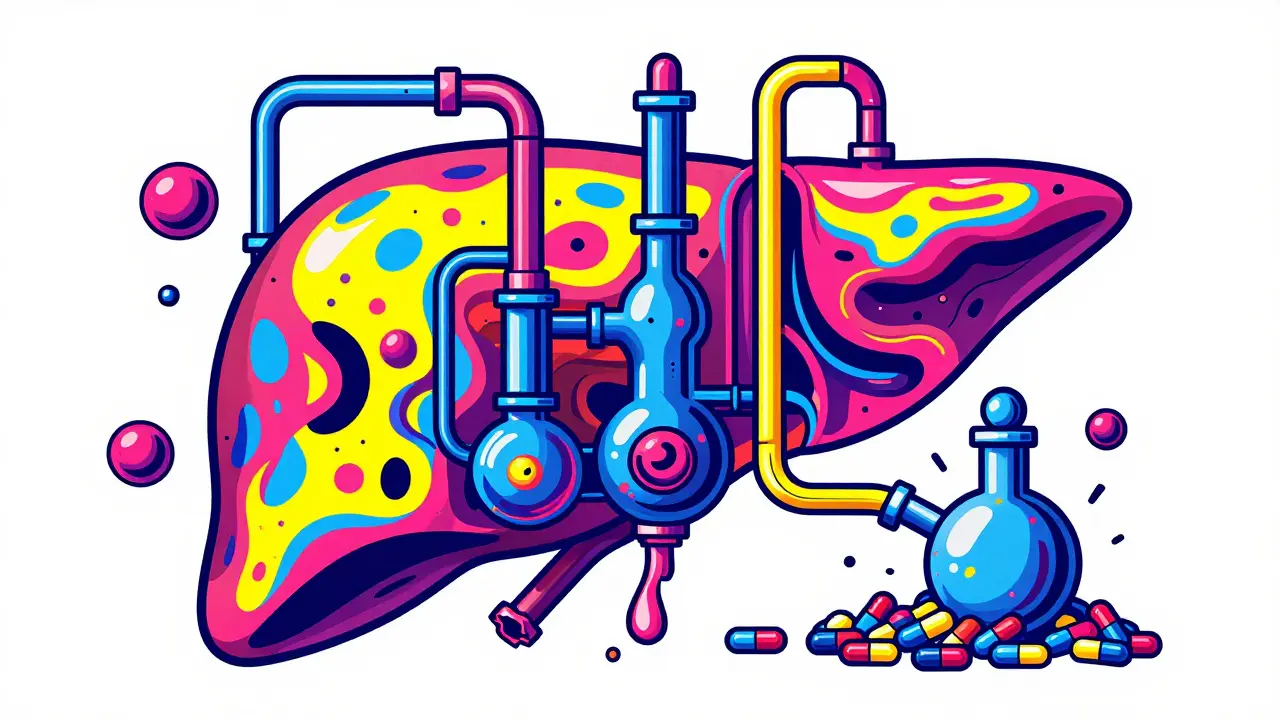 Then there is the cellular level. The liver uses enzymes to chop up drugs into smaller, water-soluble pieces that the kidneys can flush out. In advanced cirrhosis, the expression of Cytochrome P450 enzymes drops significantly. For example, CYP2E1 activity can plunge by 40-60%, and CYP3A4-one of the most important enzymes for a huge variety of medications-often drops by 30-50%. When these enzymes are missing, the drug stays in your system longer, effectively increasing the dose every time you take another pill.